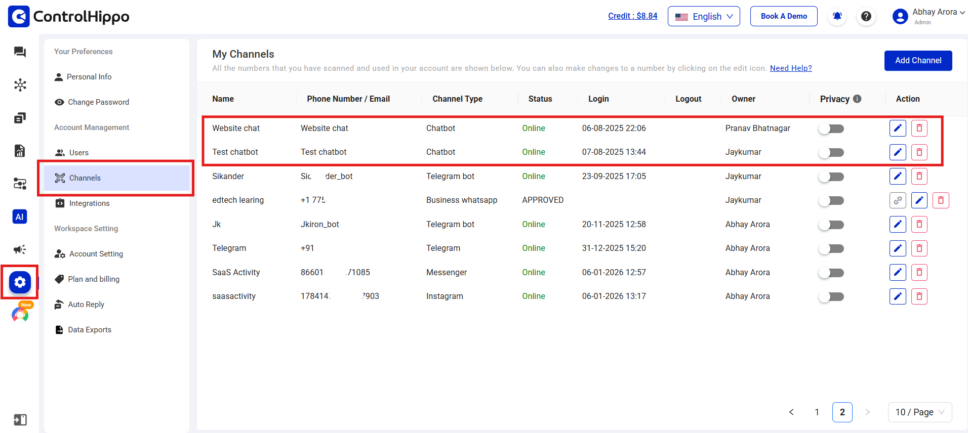 Step 3: Find the Chatbot channel and click the Edit icon under the Action column.